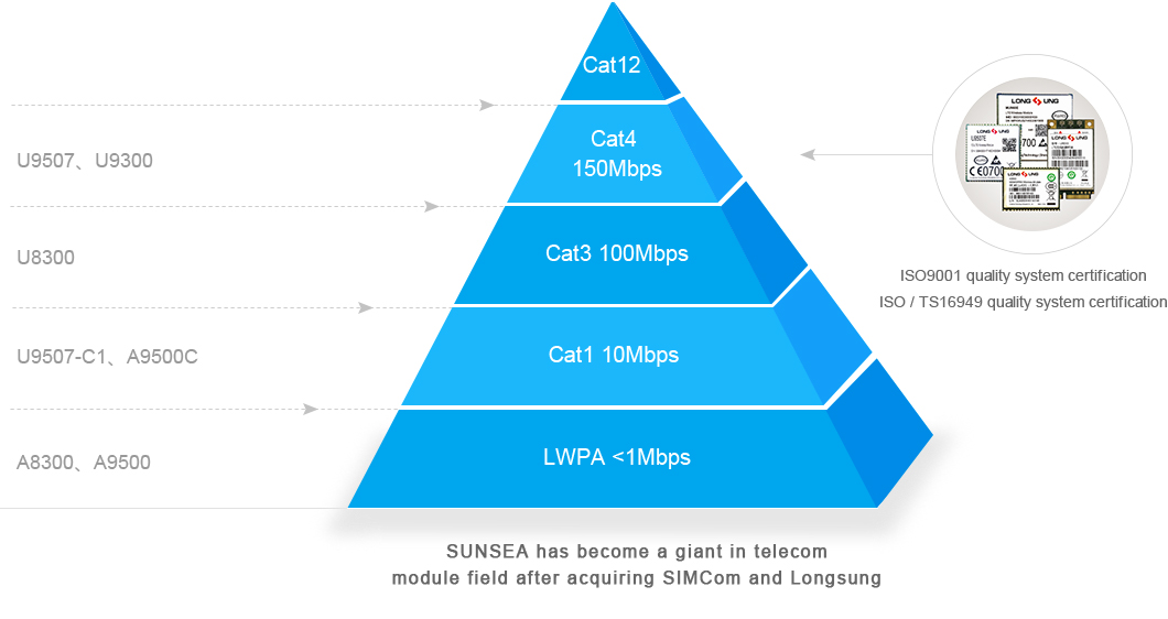 Sunsea has whole series wireless communication modules, products cover GSM/GPRS, WCDMA/HSPA+, CDMA/EVDO, TD-SCDMA, NB-IoT, eMTC, LTE, etc.